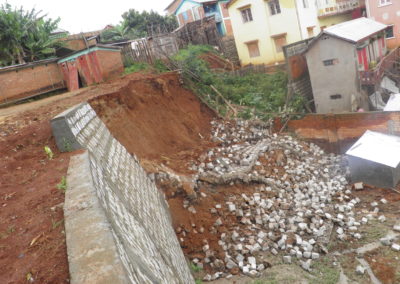 Suite à des malfaçons, un mur de soutènement s’est écroulé mettant en danger, à la prochaine saison des pluies, l’habitation voisine. Il y avait donc urgence à reconstruire sans attendre d’hypothétiques recours juridiques contre le constructeur.
